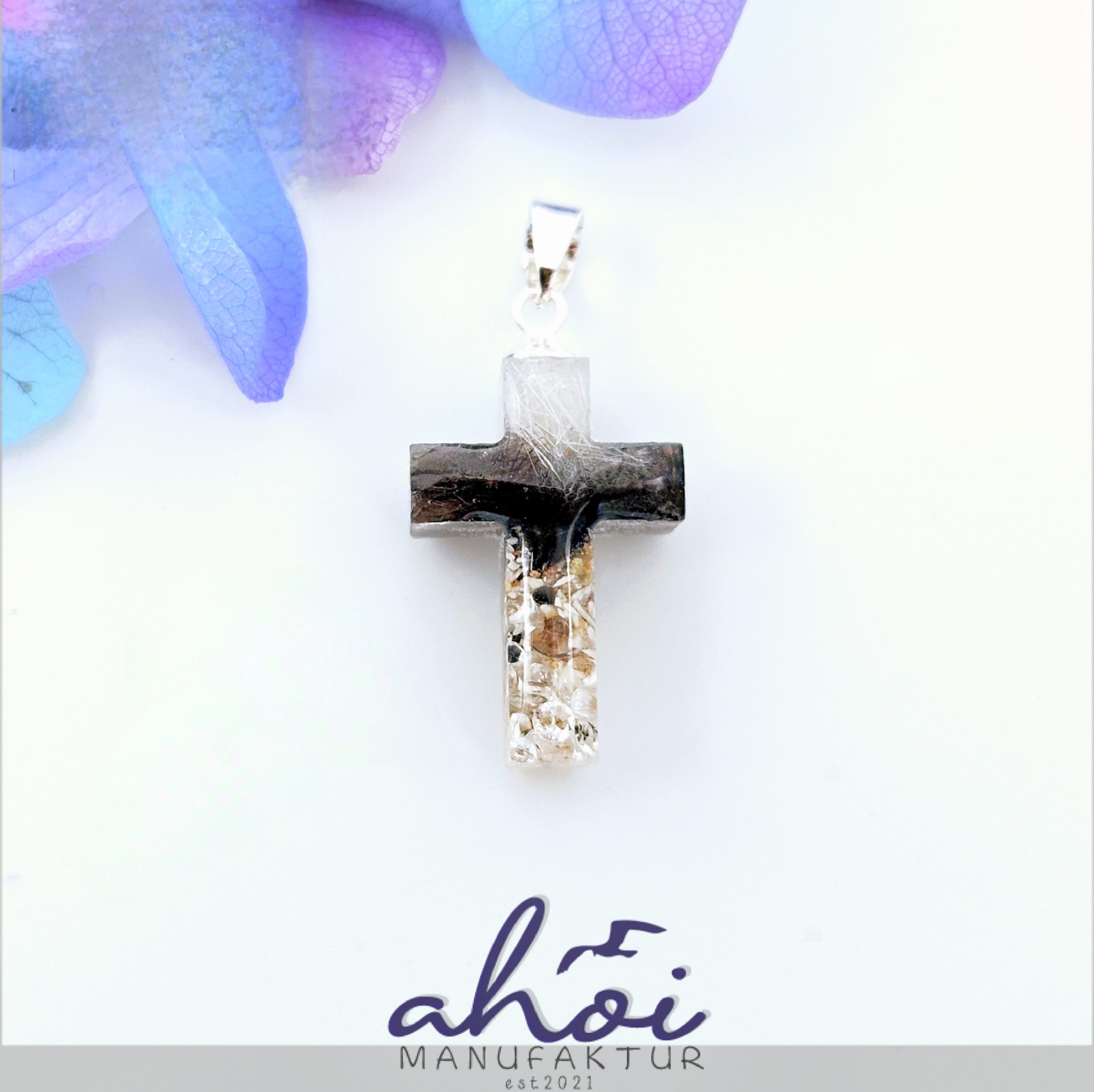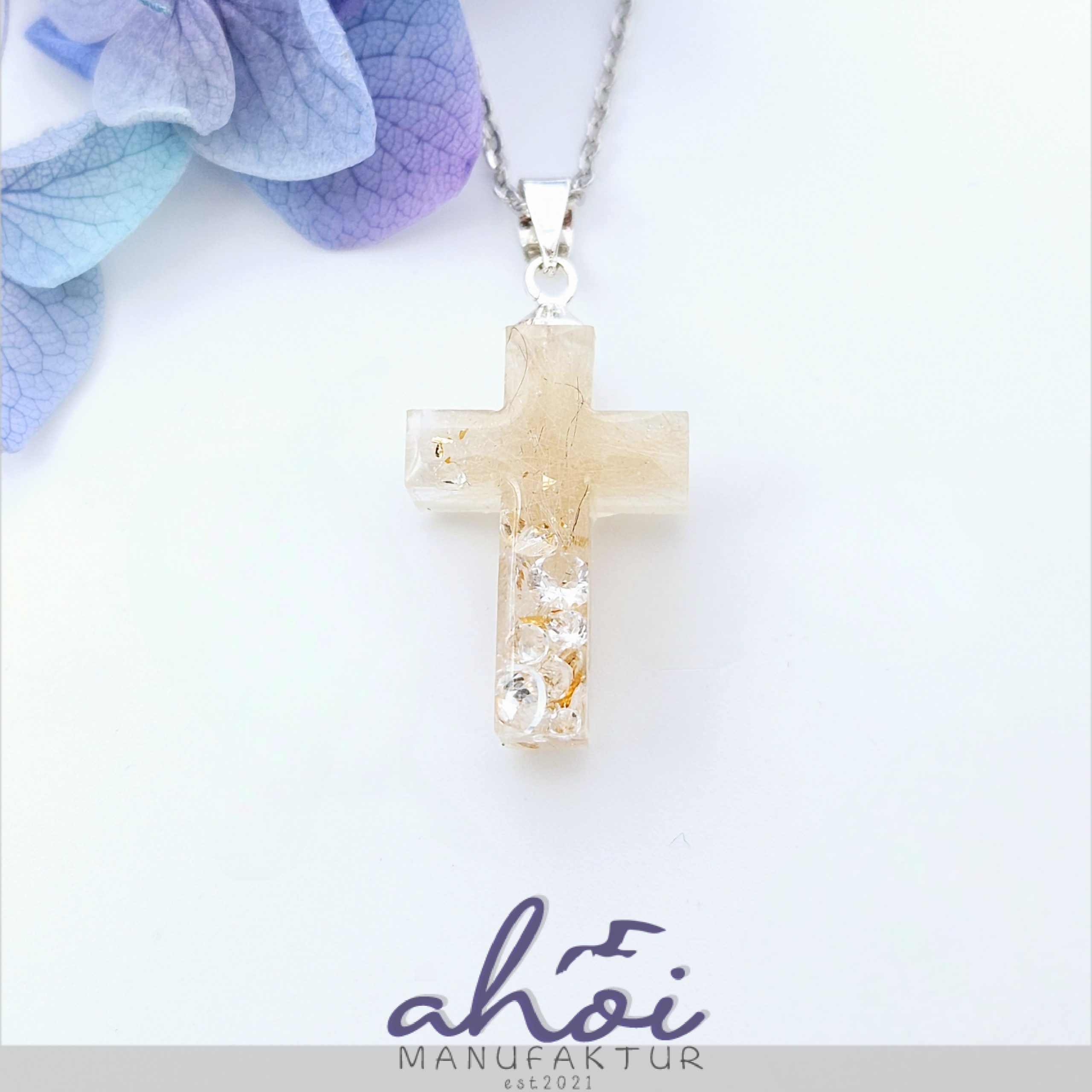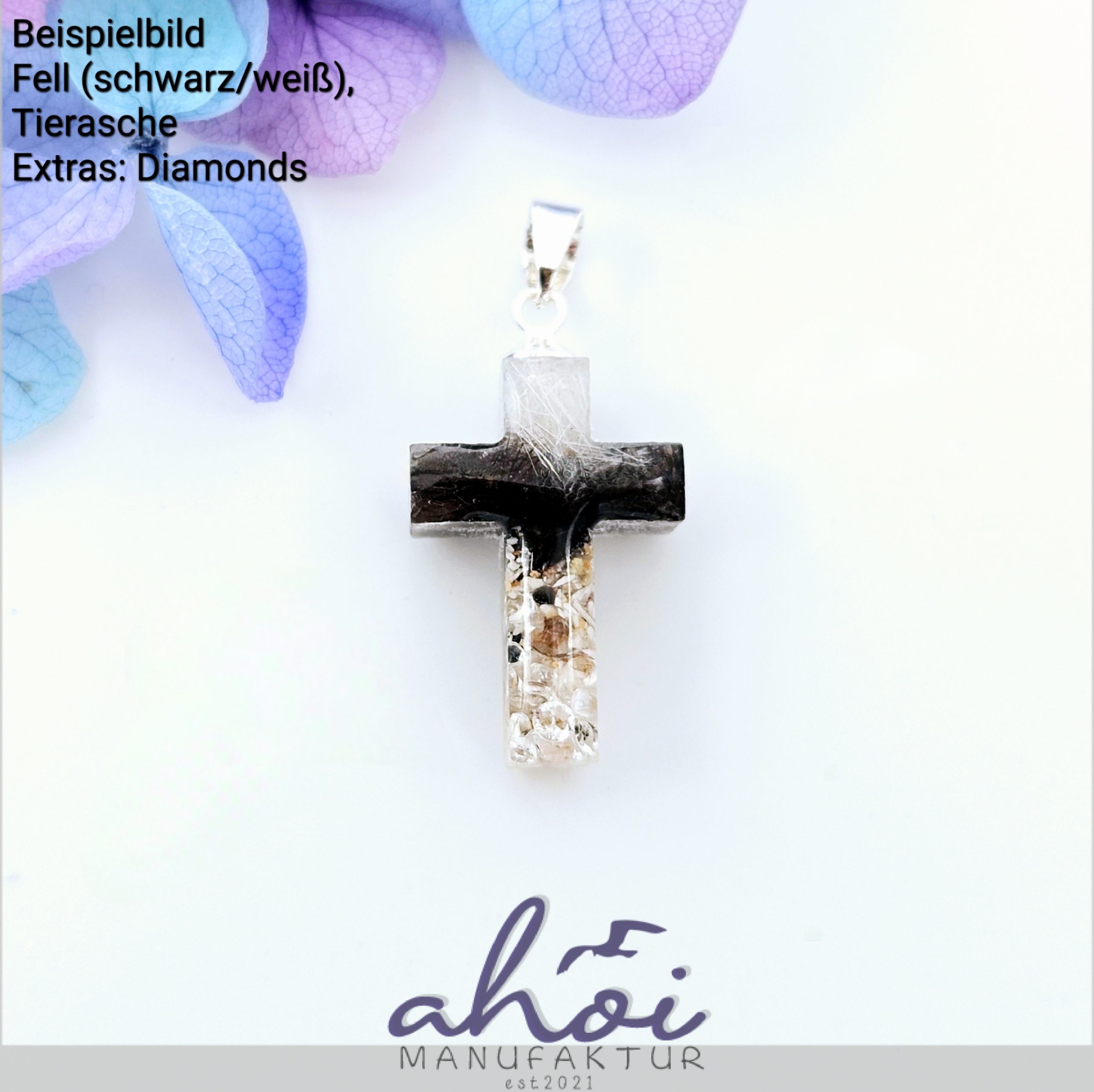 Trage deine wertvollsten Erinnerungen in einem zarten Kreuz-Anhänger immer nah bei dir. Mit viel Liebe handgefertigt, befüllt mit Haar, Fell, Federn, Tiersche oder anderen besonderen Andenken – ergänzt durch eine elegante 925-Silberöse. Auf Wunsch lassen sich zusätzliche Extras wie Blüten oder Blattflocken hinzufügen, damit ein einzigartiges Unikat entsteht, das deine Geschichte und Verbundenheit für immer bewahrt.