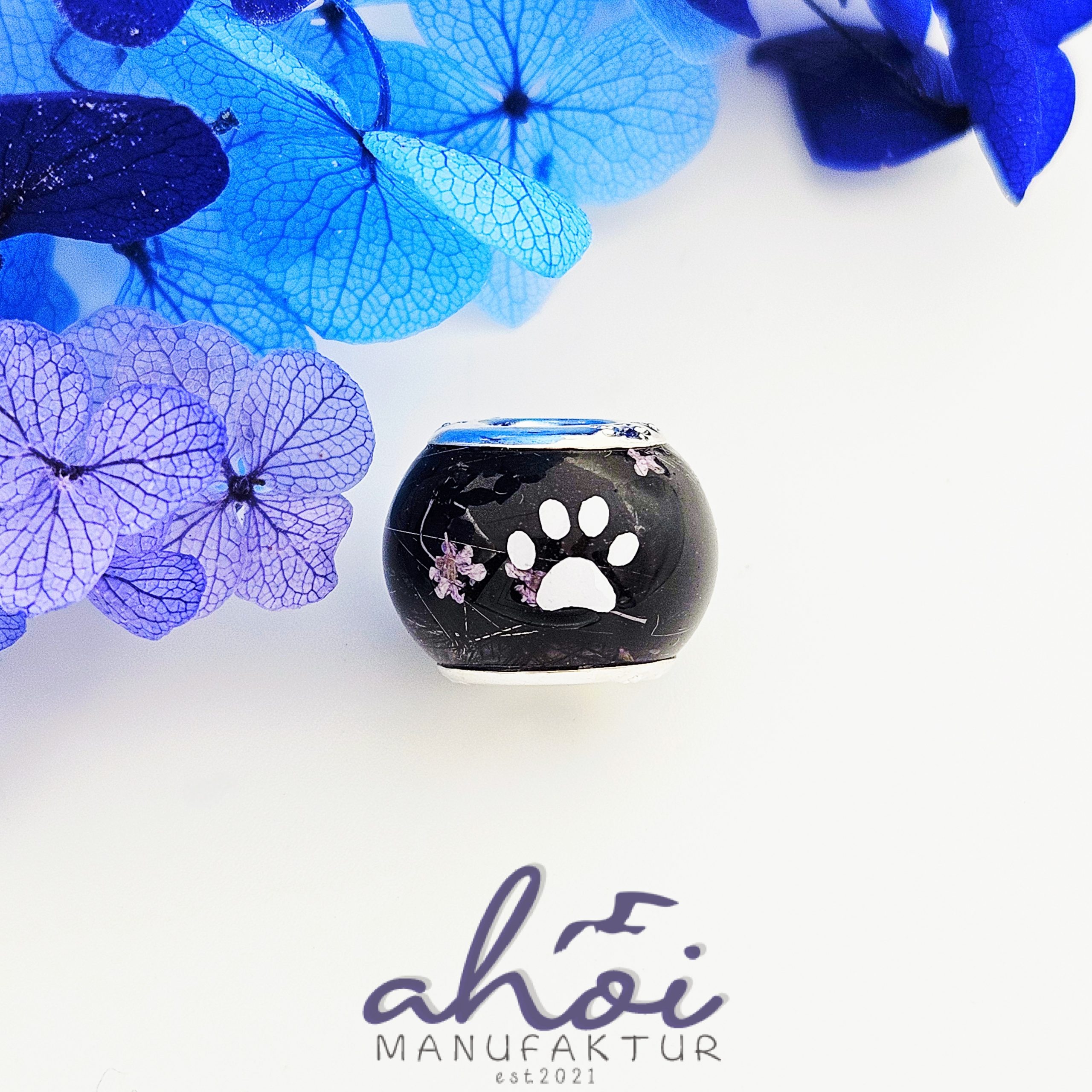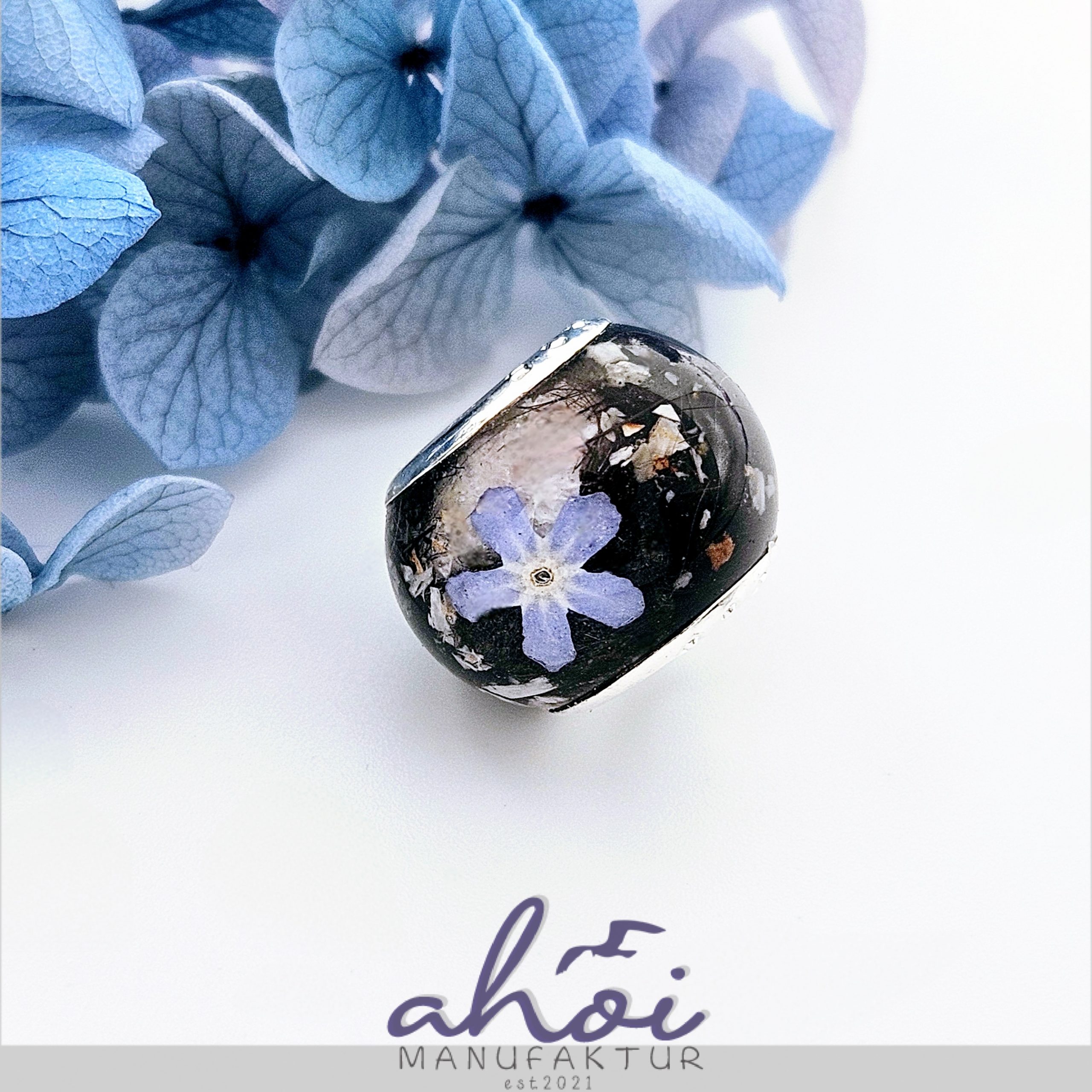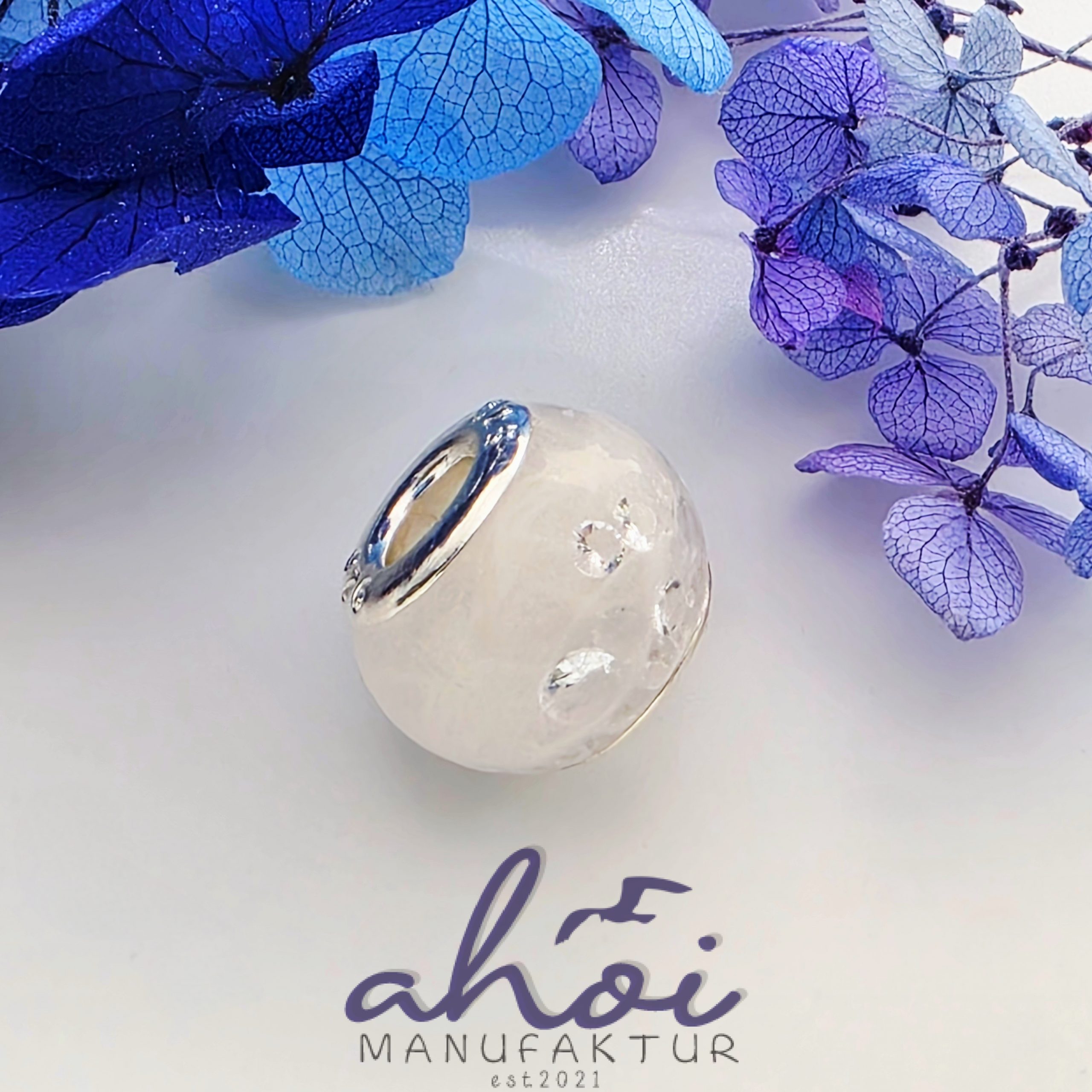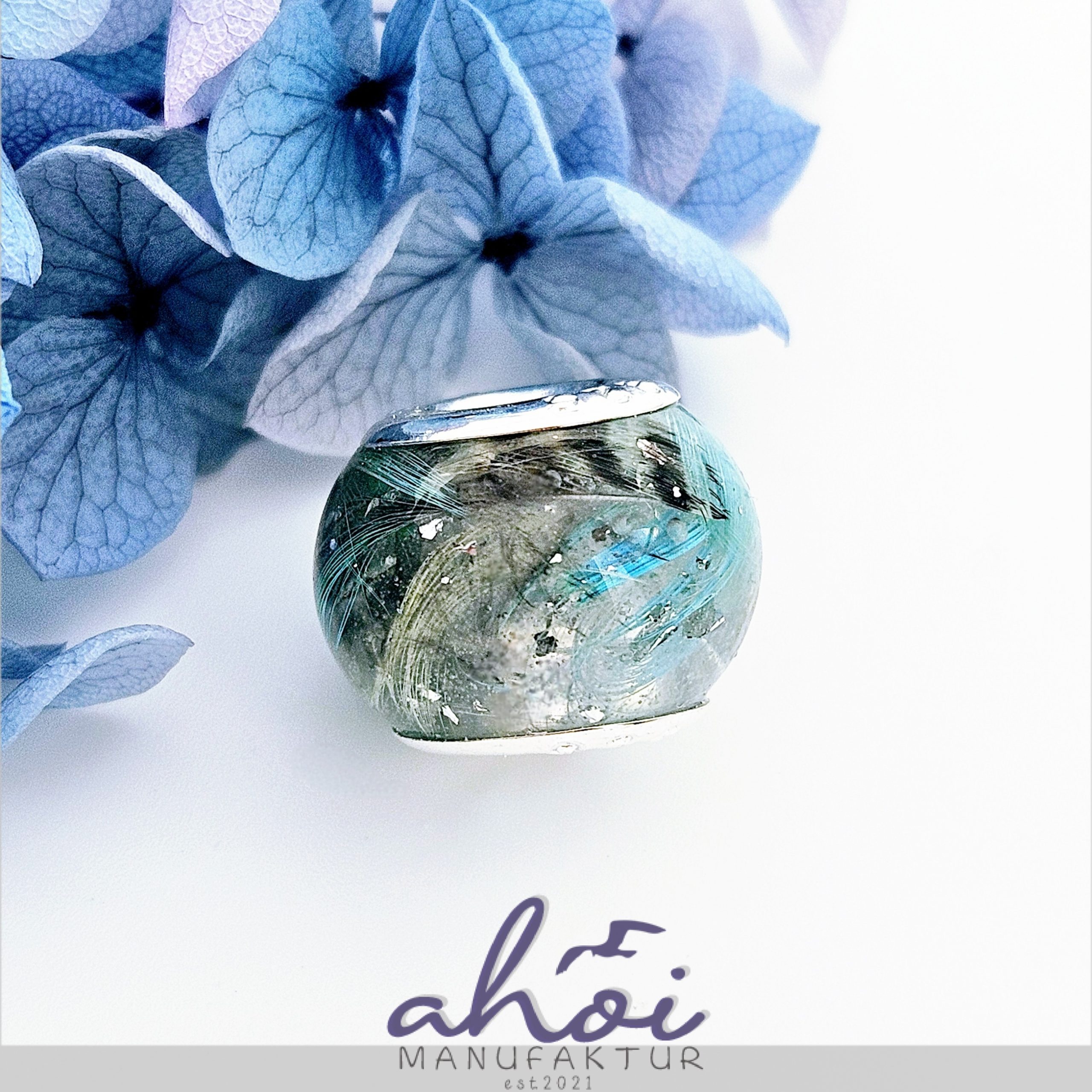 Meine Erinnerungs-Perle fertige ich individuell an. Sie ist ca. 1 cm breit und hat ein Loch mit einem Durchmesser von 4,5–5,0 mm. Die Öse ist wahlweise aus versilbertem Messing oder 925 Silber gefertigt.