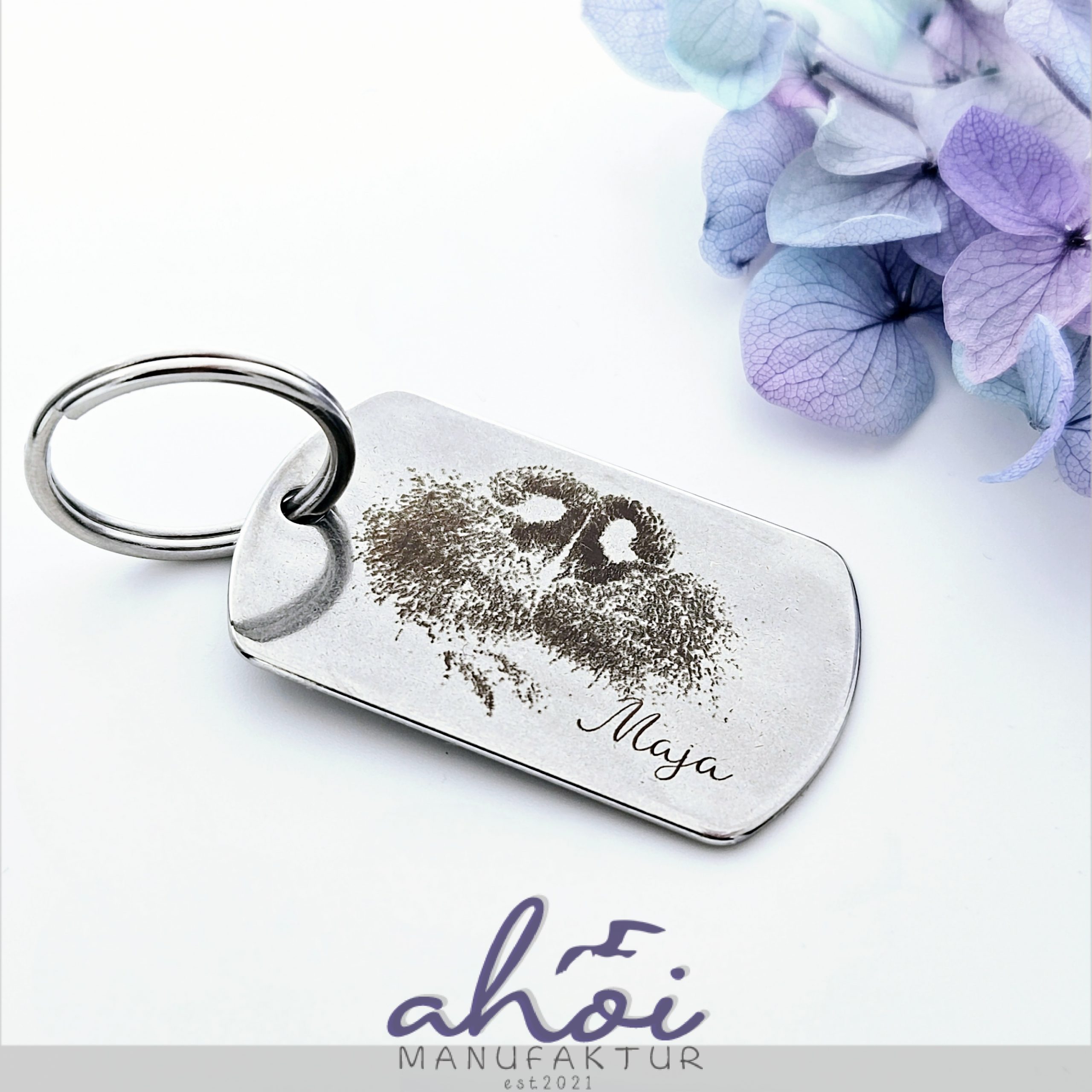 Trage deine persönliche Botschaft immer bei dir – mit einem einzigartigen Schlüsselanhänger aus Edelstahl. Individuell für dich graviert mit Pfoten-, Hand-, Fuß-, Huf-, Vogelfuß- Abdruck, entsteht ein persönliches Unikat, das dich im Alltag begleitet. Wähle auf Wunsch zusätzliche Extras wie besondere Schriften oder Symbole und kreiere ein Schmuckstück voller Bedeutung, das dich überallhin begleitet.